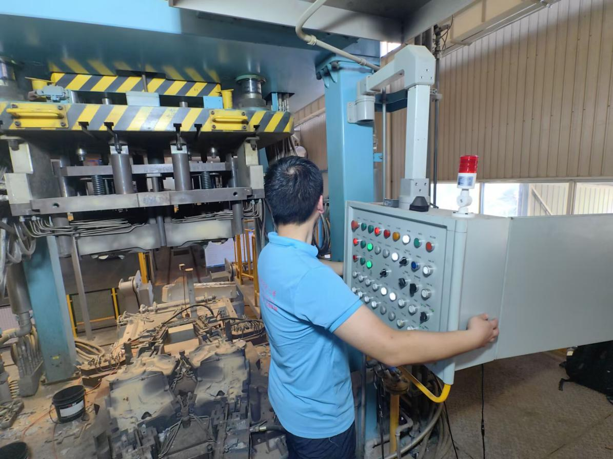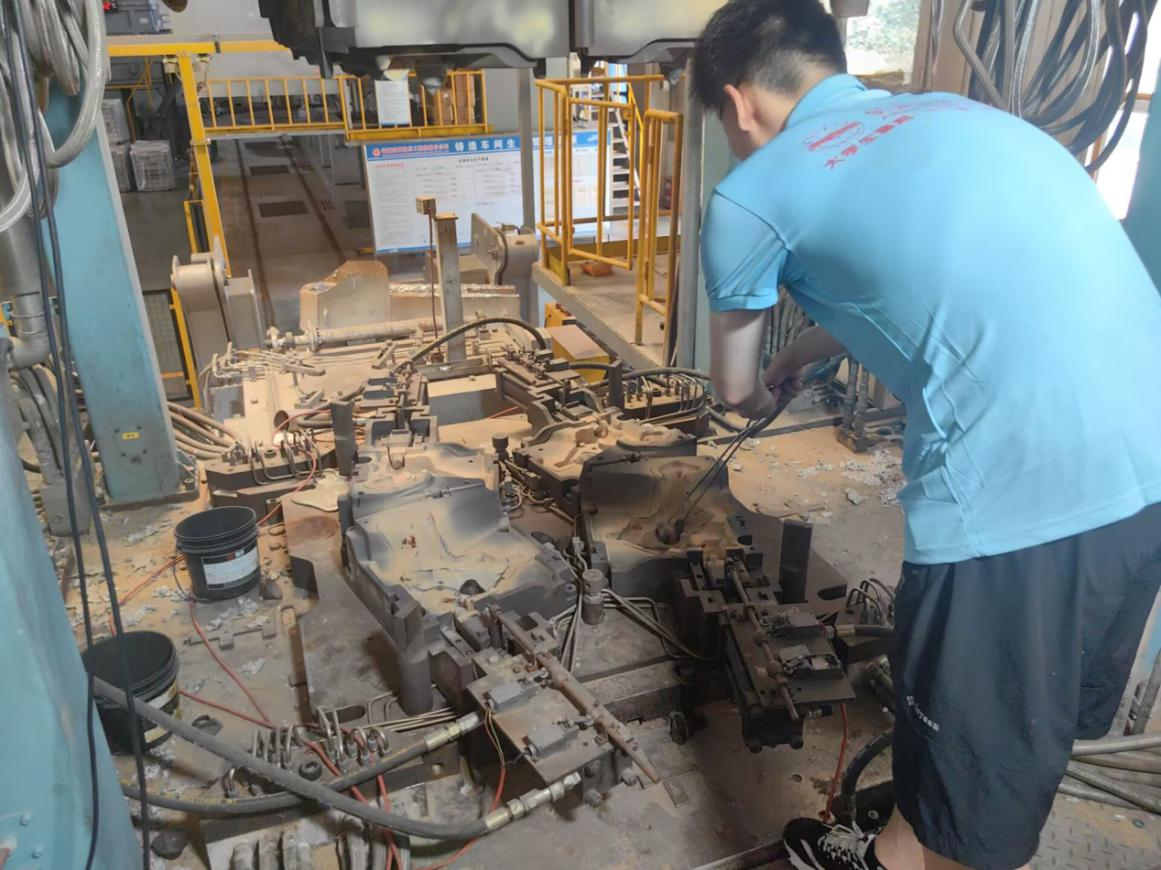 图为团队成员在压铸车间调试系统