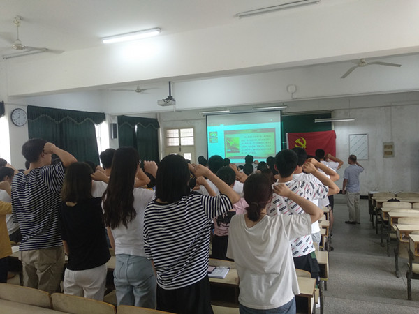 仪式在充满激越之情的国际歌声中开始,李培森宣读了学院新发展的党员名单,学生支部书记方中政、林冠男为新党员佩戴党徽、颁发了新党员政治生日提醒卡,在领誓人夏梦寒老师的带领下,全体党员面向鲜艳的党旗,举起右手,庄严宣誓:"我志愿加入中国共产党,拥护党的纲领,遵守党的章程,履行党员义务,执行党的决定,严守党的纪律,保守党的秘密,对党忠诚,积极工作,为共产主义奋斗终生,随时准备为党和人民牺牲一切,永不叛党。"随后新老党员代表依次发言,新党员湛永鑫从坚定政治理想、日常学习、全心全意为人民服务、积极参加活动四个方面表达了新一批党员的入党豪情和积极努力的决心。老党员翟静波则分享了自己成长经历,与广大新党员共勉去做新时代青年,要立鸿鹄志、做奋斗者,要知行合一、做实干家,要求真学问、练真本领。