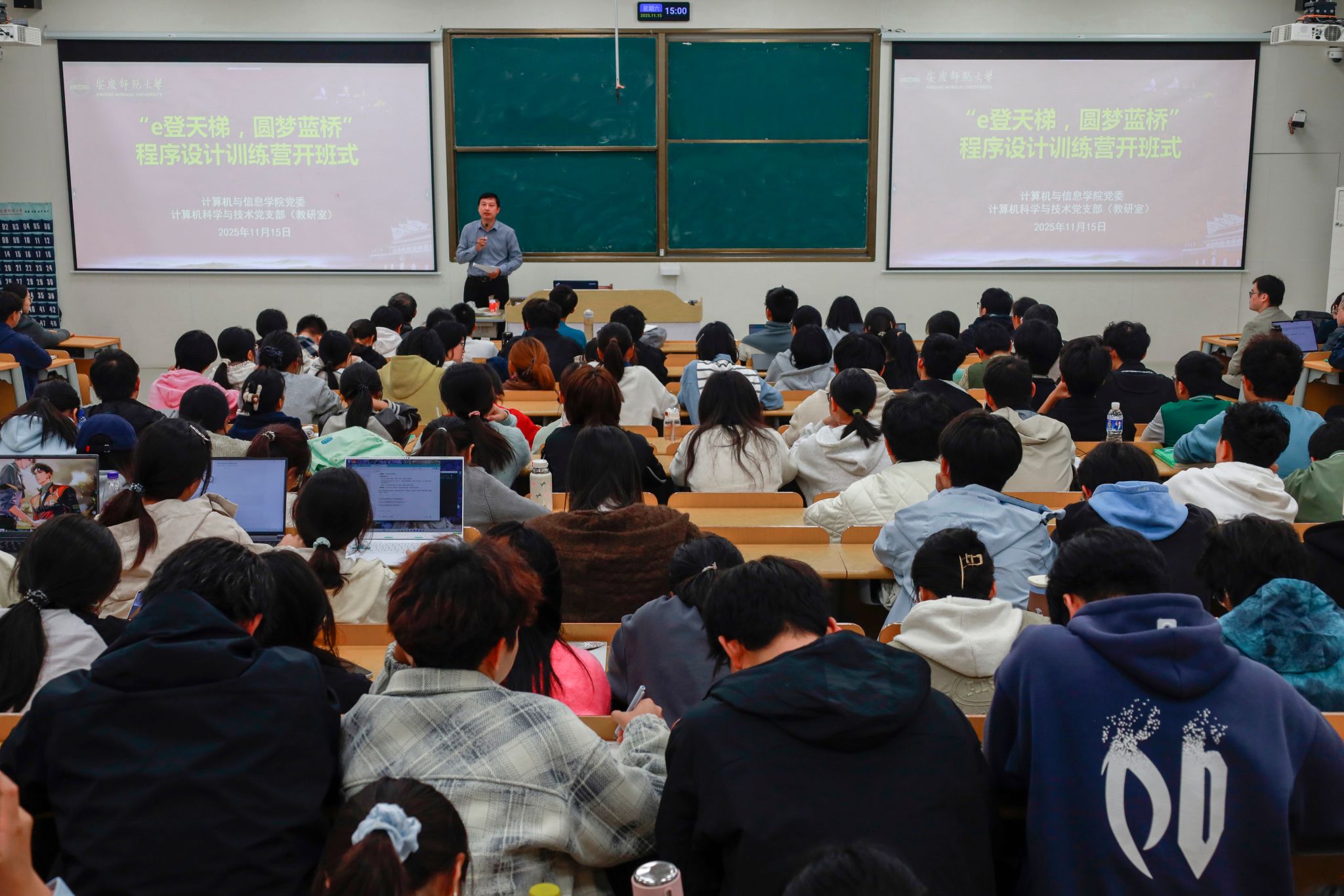 11月15日,学院在C108教室举行“e登天梯,圆梦蓝桥”程序设计训练营开班仪式。学院党委副书记肖之进,党委委员、计算机科学与技术党支部书记、教研室主任江克勤,教师代表及参训学员等150余人参加活动。