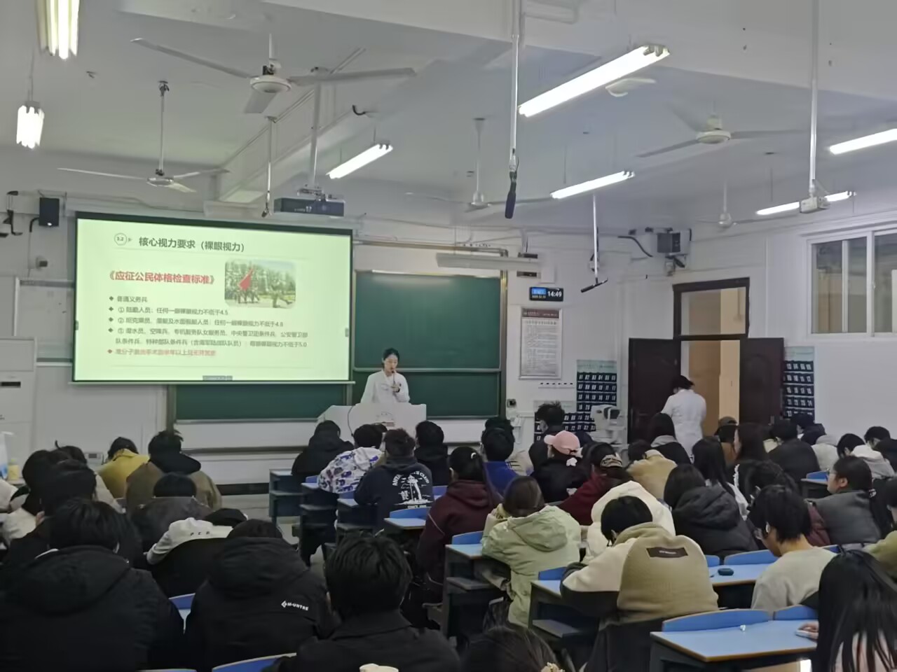 讲座中,刘丹医生详细讲解了近视等常见眼病的成因与危害,列举了不良用眼习惯,并重点阐述了高度近视可能引发的系列并发症,深刻揭示了视力健康的重要性。为帮助同学们直观了解自身眼睛状况,现场引导同学们进行眼睛亚健康自测。并针对学生群体中普遍的视力问题,提供了包括饮食调整、规范做眼保健操在内的实用护眼攻略,还就激光手术矫正视力等话题进行了专业说明。讲座结束后,医疗团队还为同学们提供了免费的视力检测服务,大家踊跃参与,气氛热烈。