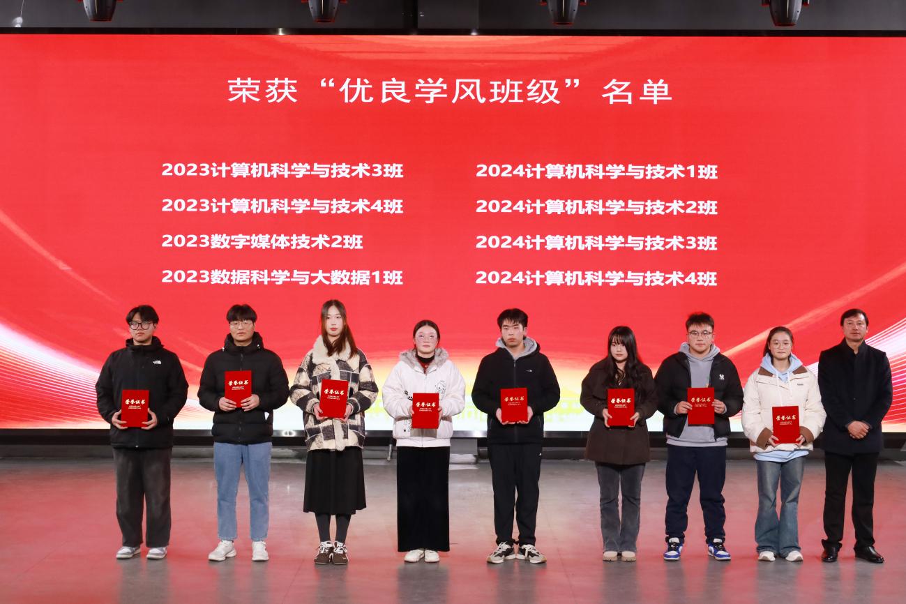 获奖代表分别发言,学科专业竞赛获奖代表、2023级数媒2班韦秀敏分享了从校级比赛到高水平竞赛的成长经历,并表示竞赛的意义不仅在于获奖,更在于锻炼系统解决问题能力、团队协作精神和应对挫折的毅力。2023级计科3班、红芯e家党支部积极分子张国栋结合自身学习和班级工作经历,表示作为班长要在保持优异成绩的同时,更要积极发挥桥梁作用,带动班级形成“比学赶超”的良好氛围。