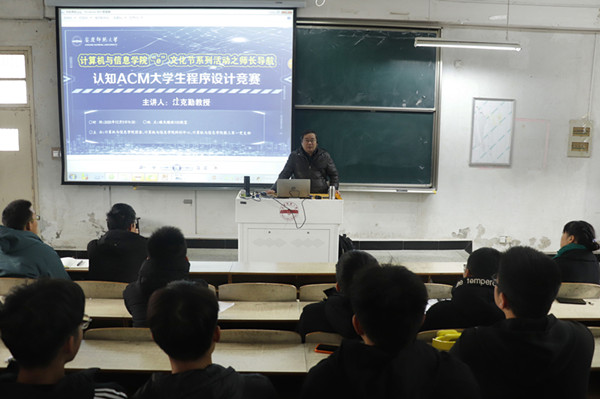 “什么是ACM?”“怎样学好计算机编程?”近日,我院在稼先楼201教室举办了“e”文化节之师长导航报告会,学院江克勤教授做了关于程序设计大赛的专题报告,学院相关老师及各班级学生代表参加了报告会。
