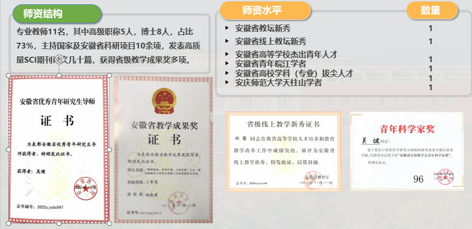 教学团队包括11位优秀专业教师,其中8位拥有博士学位,5位拥有高级职称。团队教师深耕教学与科研,主持国家与省部级科研项目10余项,发表高质量SCI论文几十篇,并荣获安徽省教坛新秀、安徽省青年皖江学者、安徽省高校学科(专业)拔尖人才、安徽省优秀青年研究生导师等荣誉。