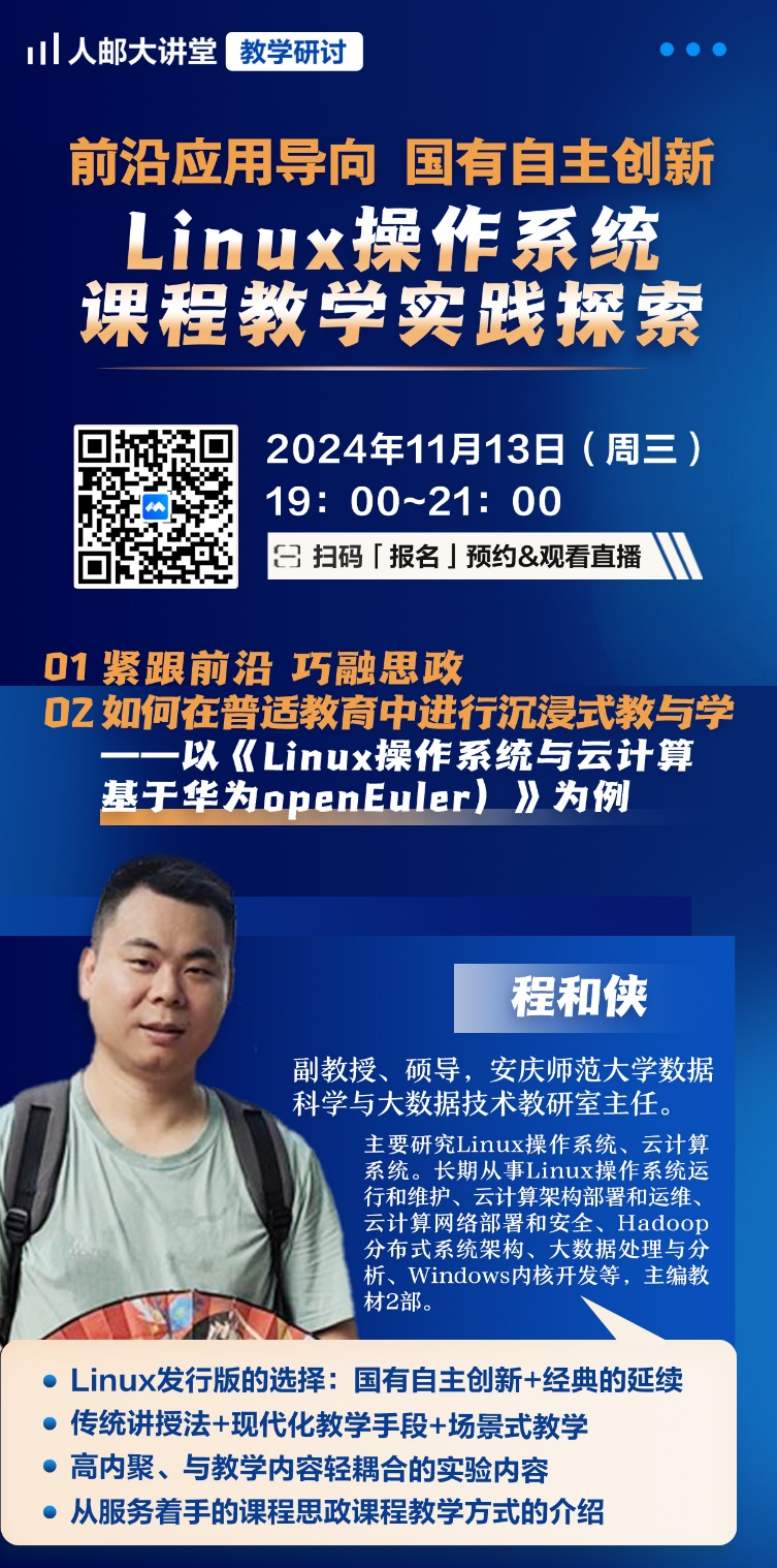 11月13日,365上市公司程和侠老师应邀参加人邮大讲堂线上教学研讨会。此次研讨会主题是“前沿应用导向 国有自主创新——Linux操作系统课程教学实践探索”,程和侠老师在会上做题为“如何在普适教育中进行沉浸式教与学——以《Linux操作系统与云计算(基于华为openEuler)》为例”的报告。