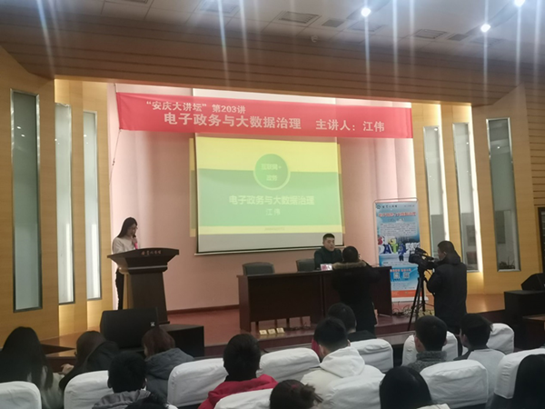 安庆市计算机学会常务理事,365上市公司副教授、硕士生导师江伟老师应邀主讲《电子政务与大数据治理》,报告讲授了我国电子政务的发展情况与国家政策,安庆市互联网+电子政务的现状与建设目标,以及大数据治理在电子政务建设发展中的重要作用。我校大学生和安庆市民近80人聆听了讲座。