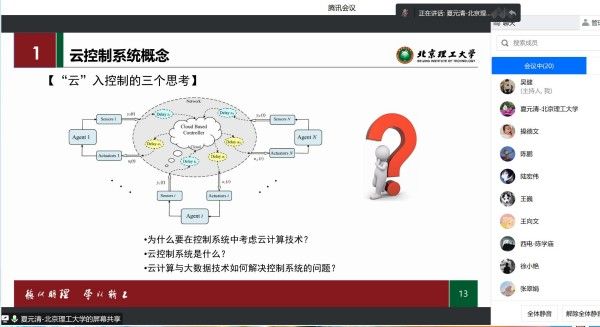 夏元清教授分别就云控制系统的产生背景、关键科学问题、最新研究进展及所面临的挑战等方面作了介绍。他指出,传统的控制技术难以满足高品质和实时控制的要求,为此,云控制系统(Cloud Control Systems,CCSs)的概念被创造性地提出,控制的实时性因为云计算的引入得到了保证。通过各种传感器感知汇聚而成的海量数据储存在云端,在云端利用人工智能等智能算法,实现系统的在线辨识与建模,结合模型预测控制、数据驱动控制、云网边端协同控制等先进控制方法实现系统的自主智能控制。报告会后,我院多位教师和同学就实验环境选择和边缘计算等内容与夏教授进行了深入交流,同学们都表示受益匪浅。