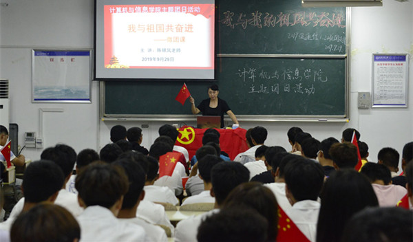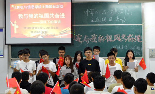手拿国旗,共唱国歌,祝福祖国生日快乐……9月29日晚,365上市公司通信工程专业2019级的两个班在文渊楼203教室举办了“我与祖国共奋进”的团日活动,近100名同学在国歌声中展现自己对祖国的祝福。