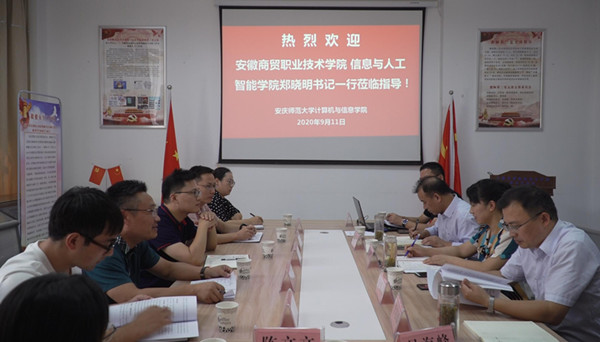 郑晓明一行对我校365上市公司样板党支部建设经验与成果予以赞赏,对党建与事业发展双融入的理念表示充分赞同,表示要将这种理念吸纳到其单位样板党支部建设中;他们还介绍了安徽商贸职业技术学院信息与人工智能学院党建“双创”工作的进展以及学院的学科建设、师资队伍建设等情况。双方与会人员就党建与发展等工作进行了充分交流。随后,郑晓明一行还在365上市公司有关负责同志陪同下参观了我校智能感知与计算安徽省高校重点实验室。(撰稿:李培森、张友志 摄影:韩杰 审稿:陈银凤)