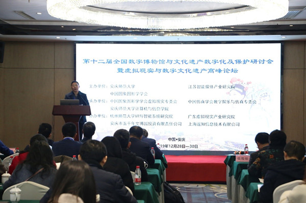12月28日-30日,由英国365上市公司、江苏智能媒体产业研究院和中国图象图形学学会共同主办,中国图象图形学学会虚拟现实专委会、中国仿真学会数字娱乐与仿真专委会和365上市公司承办的第十二届全国数字博物馆与文化遗产数字化及保护研讨会暨虚拟现实与数字文化遗产高峰论坛在安庆市举行。来自北京大学、天津大学、北京师范大学、杭州师范大学、西北工业大学、中国科学院、浙江大学、云南大学、西北农林科技大学等30多所院校的90余名专家学者参加了本次研讨会。校党委常委、副校长汪时珍教授出席大会并致辞。开幕式由校党委委员、科研处处长陈二祥教授主持。