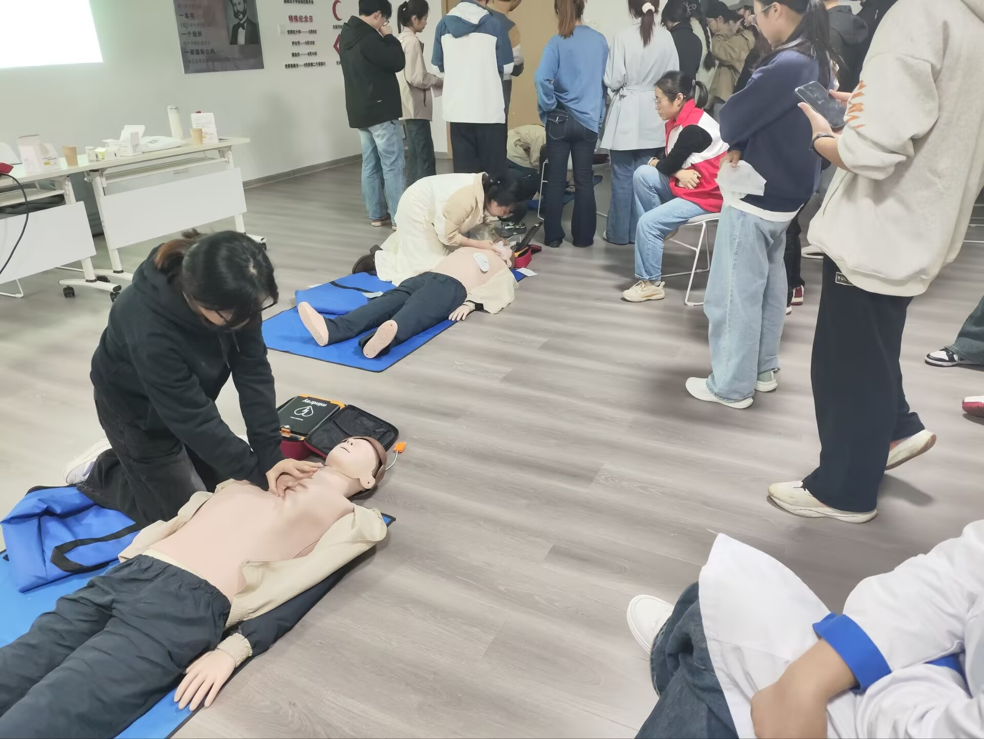 线下培训现场,校医院的专业救护师团队凭借丰富的临床经验和教学经验,为同学们带来了生动详实的讲解与演示。救护师们从应急救护的基本原则入手,着重强调了心跳呼吸骤停后的“黄金4分钟”救援时间的重要性,让同学们深刻认识到及时有效的急救对挽救生命的关键作用。在心肺复苏实操演示环节,救护师细致拆解了判断意识、呼救、胸外按压、开放气道、人工呼吸等每一个步骤,对按压深度、频率、呼吸节奏等技术要点反复强调、亲自示范。在AED使用教学中,救护师详细讲解了设备启动、电极片粘贴、故障处理等关键操作,消除了同学们对专业设备的陌生感和畏惧心理。