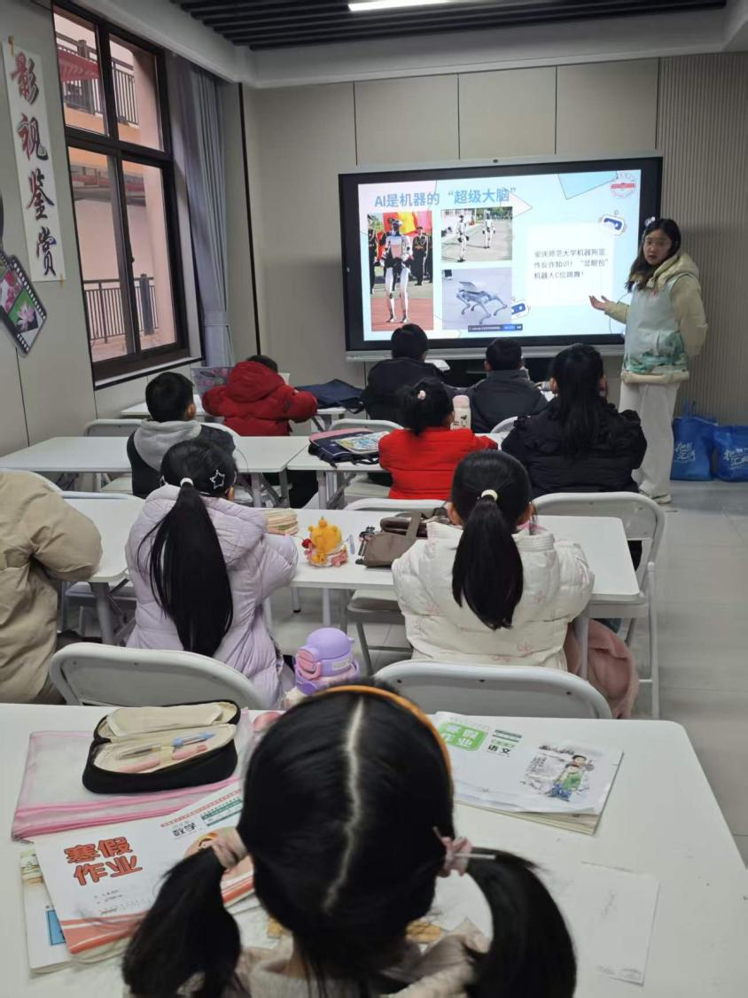 活动期间,志愿者们精心搭建集“知识、陪伴、实践”于一体的服务框架,通过作业辅导、趣味游戏、主题课堂等多元形式,为孩子们带来全方位的成长助力。依托学院人工智能专业特色,团队量身打造的两堂专题课程成为活动亮点:在“初识智能AI”启蒙课上,志愿者们借助生动演示、简易实验与趣味互动,将抽象的人工智能原理转化为孩子们易懂的生活场景,从智能音箱的语音交互到机器人的简单指令,一步步点燃孩子们对科技探索的好奇心;在“寒假居家安全”知识课上,通过情景模拟、问答竞赛等沉浸式方式,帮助孩子们筑牢安全防线,提升自我防护意识与应急处理能力。课堂上,孩子们踊跃举手、积极互动,眼神中满是对知识的渴望,欢声笑语间,科技种子与安全理念一同生根发芽。