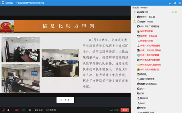 为了强化学生的法律意识,普及《中华人民共和国民法典》等法律知识,增强广大学生对信息化应用的认知以及依法保护自身合法权益的能力,6月30日下午,由学院教师第三党支部与院团委主办、敬敷女生工作坊协办的法制教育讲座通过QQ课堂在线举行,安庆市中级人民法院法官、我校优秀校友金京应邀为学院300余名学生进行了普法宣讲,讲座由学院党委副书记江伟主持。