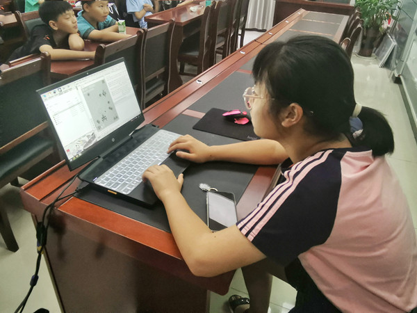 电脑编程兴趣宣讲课上,刘郑以自制游戏为例,将计算机知识融入小游戏,逐步讲解编程路径。同时,勾勒出了少儿编程的基本轮廓。上传素材、设计程序、录入代码、编录启动,刘郑娴熟的操作引起了在场小朋友的兴趣。演示结束后,来自高花亭小学六年级的胡梓瑜迫不及待地上手尝试游戏。”原来简单的字母排列蕴含着这么大的能量,我以后也想尝试进行软件编程,不断‘get’新技能。”胡梓瑜兴奋地说道。