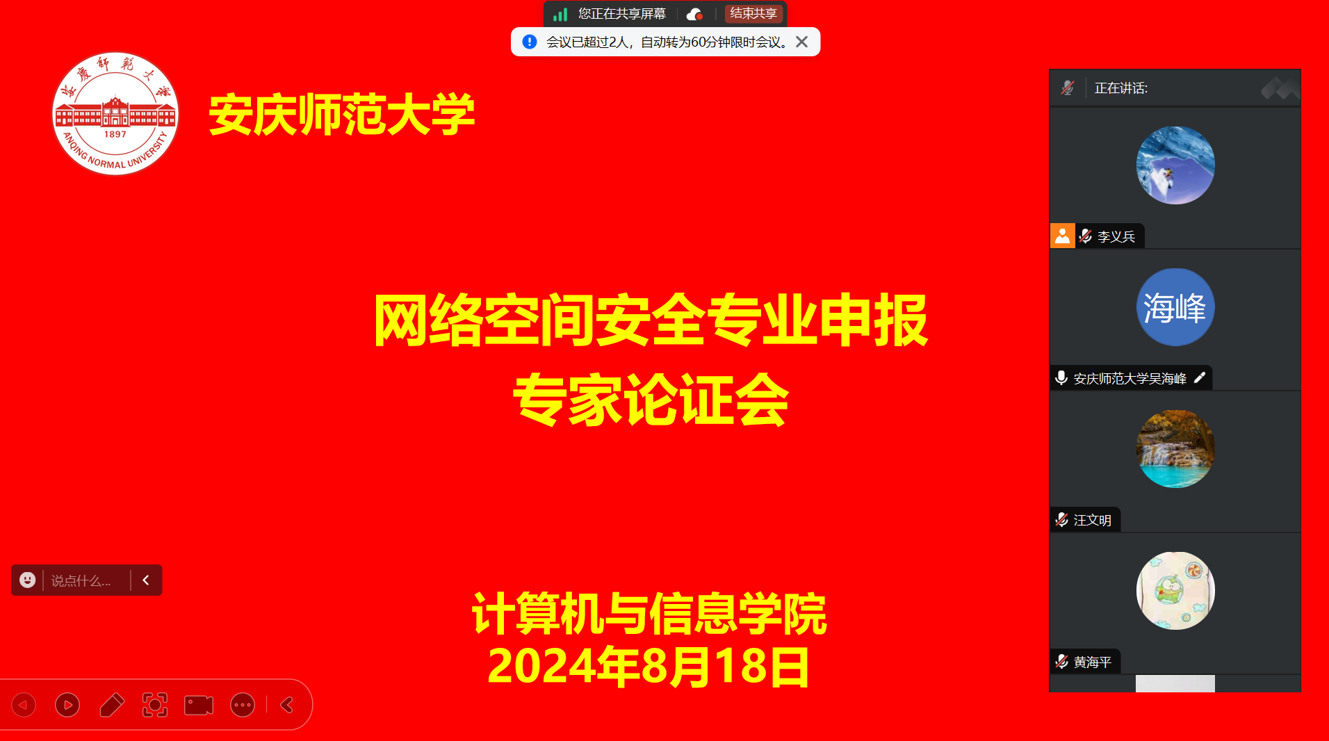 为进一步加强专业建设,优化专业结构,提高新专业申报建设质量,8月18日下午,365上市公司在线召开了网络空间安全专业申报专家论证会。会议邀请南京邮电大学网络空间安全学院副院长黄海平教授、暨南大学网络空间安全学院教授刘志全教授、安徽师范大学教授算机与信息学院副院长接标教授、安徽大学网络空间安全系主任朱二周博士、中共安庆市委网信办网络舆情管理和执法治理科科长章慎担任论证专家,教务处处长潘锦云、教研科科长朱亭曲、副院长王远志、物联网工程教研室主任汪文明、新专业教师代表及教学办公室成员参加论证会,会议由副院长吴海峰主持。