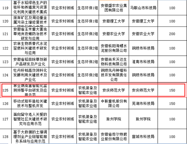 日前,安徽省2019年科技重大专项揭晓,我院刘奎博士主持申报的“林业病虫害智能化监测预警平台研发及应用示范”项目成功立项,并获得150万元的科技经费资助。这是我院继2018年首次成功申报该项目后的又一新突破。